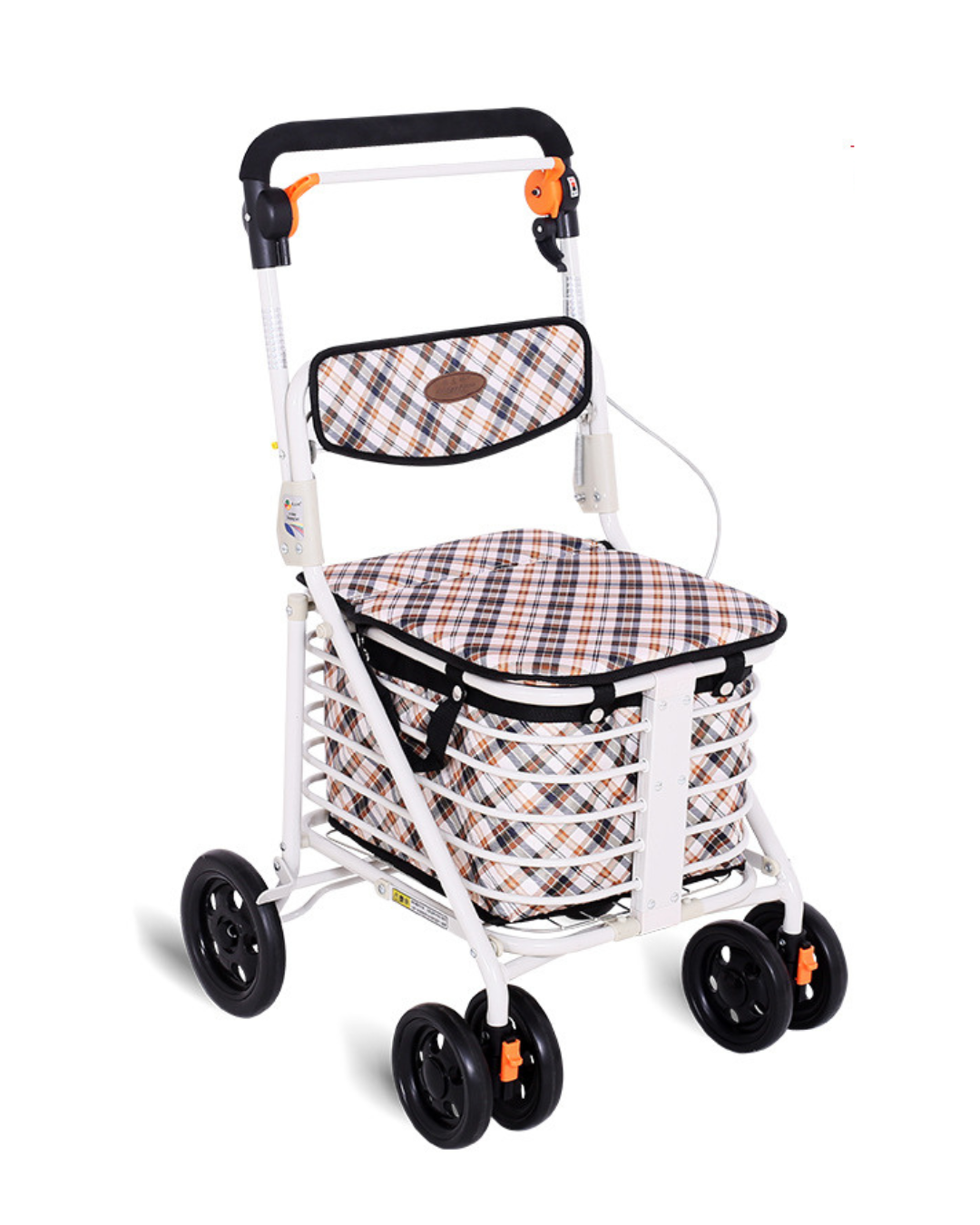 チェック柄デザインで座れる四輪タイプ買い物時の荷物をたっぷり収納でき移動中の負担を軽減するシルバーカー
