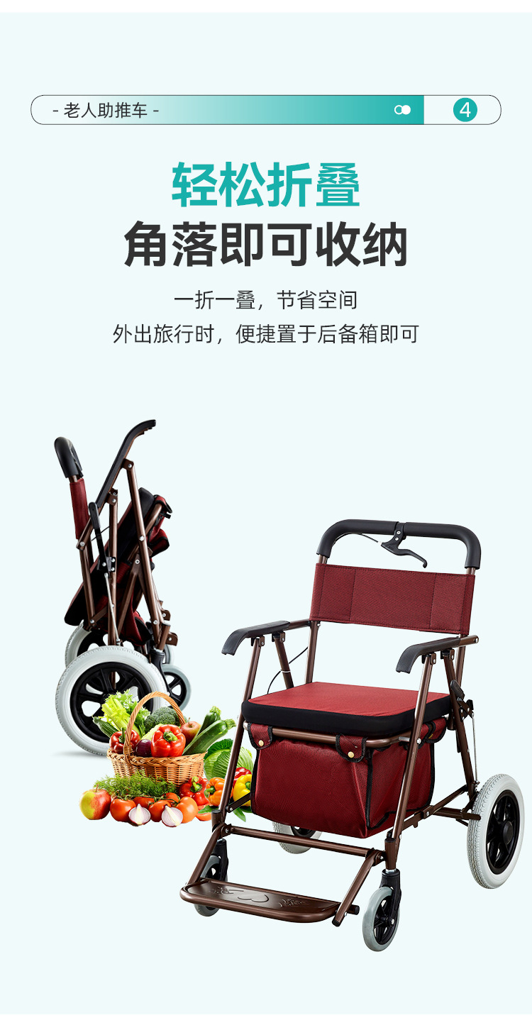 疲れた時にはいつでも腰掛けられる便利な座面と、お買い物に便利な大容量収納袋を装備しています。