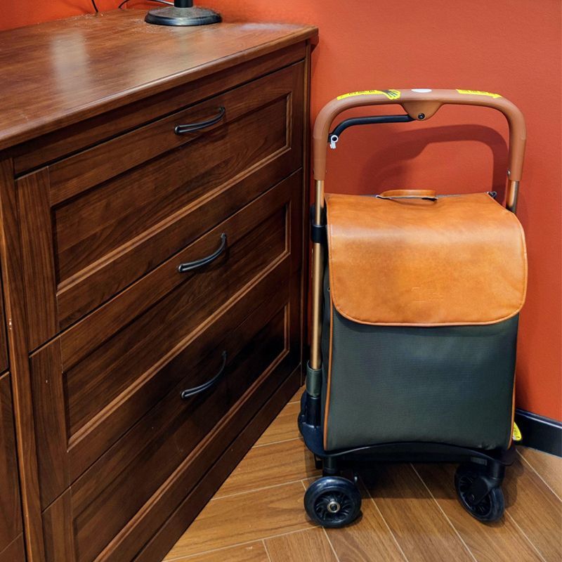 フタ付きの収納袋が付いており、買い物や散歩の荷物をしっかり収納できます。
