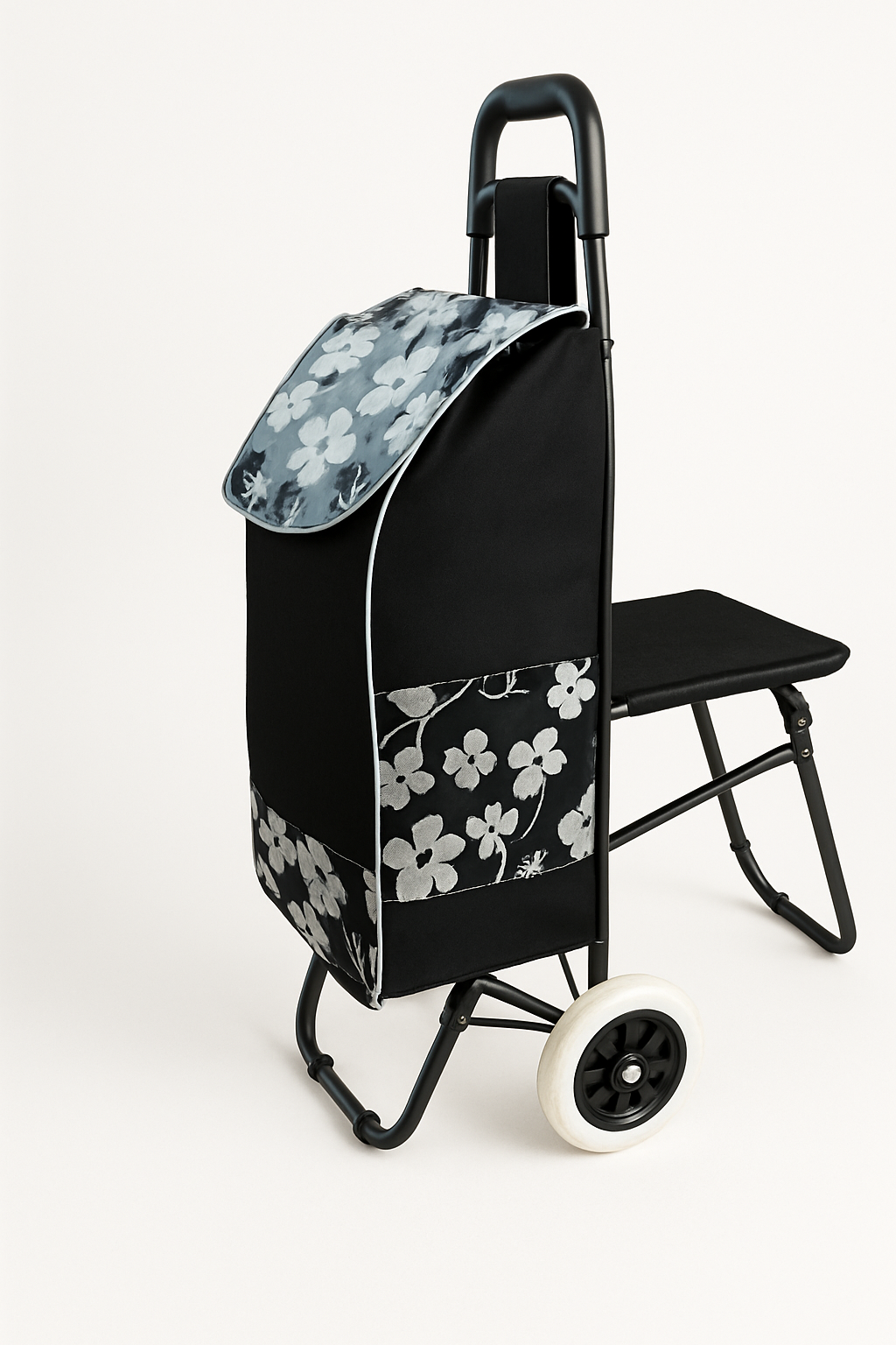 座れるシルバーカーとして使える便利な多機能カートです。 丈夫な折りたたみ椅子が付いており、お買い物途中の休憩に最適です。 大容量の収納バッグは花柄のデザインで華やかさを演出します。 二輪タイプで軽快に移動でき、日常のお買い物から散歩まで幅広く活躍します。 シルバーカーとしても使えるので、高齢者の方の外出をしっかりサポートします。